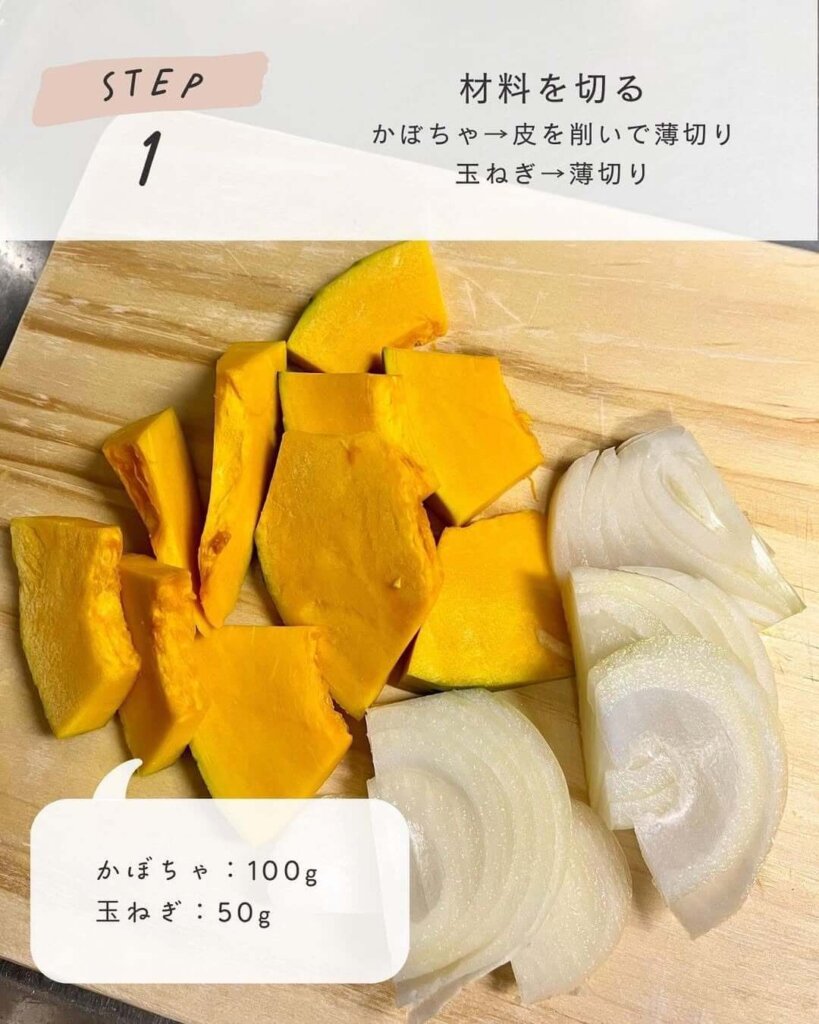 かぼちゃは皮を削いで薄切り、玉ねぎは薄切りにする。