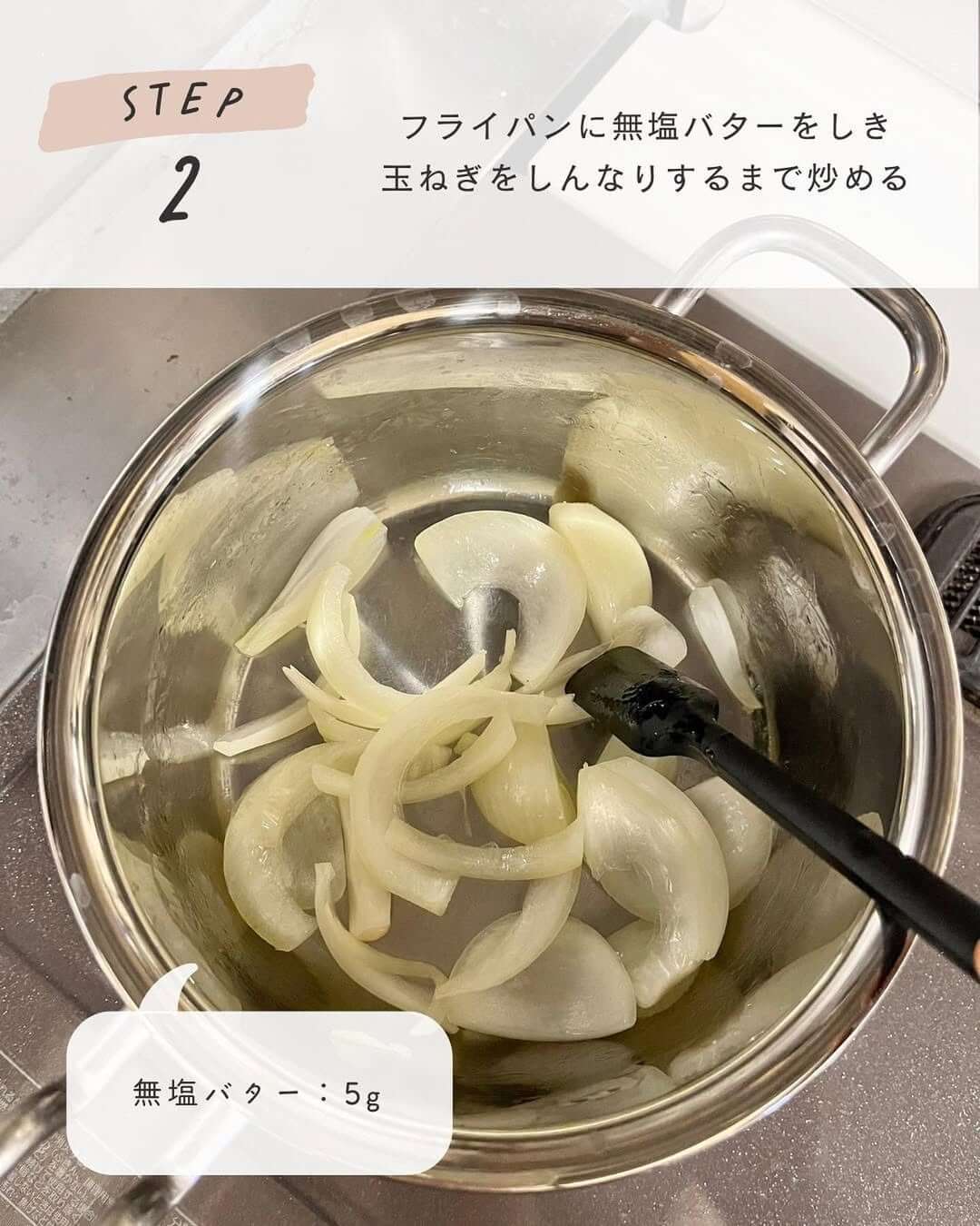 フライパンに無塩バターをしき、玉ねぎをしんなりするまで炒める。