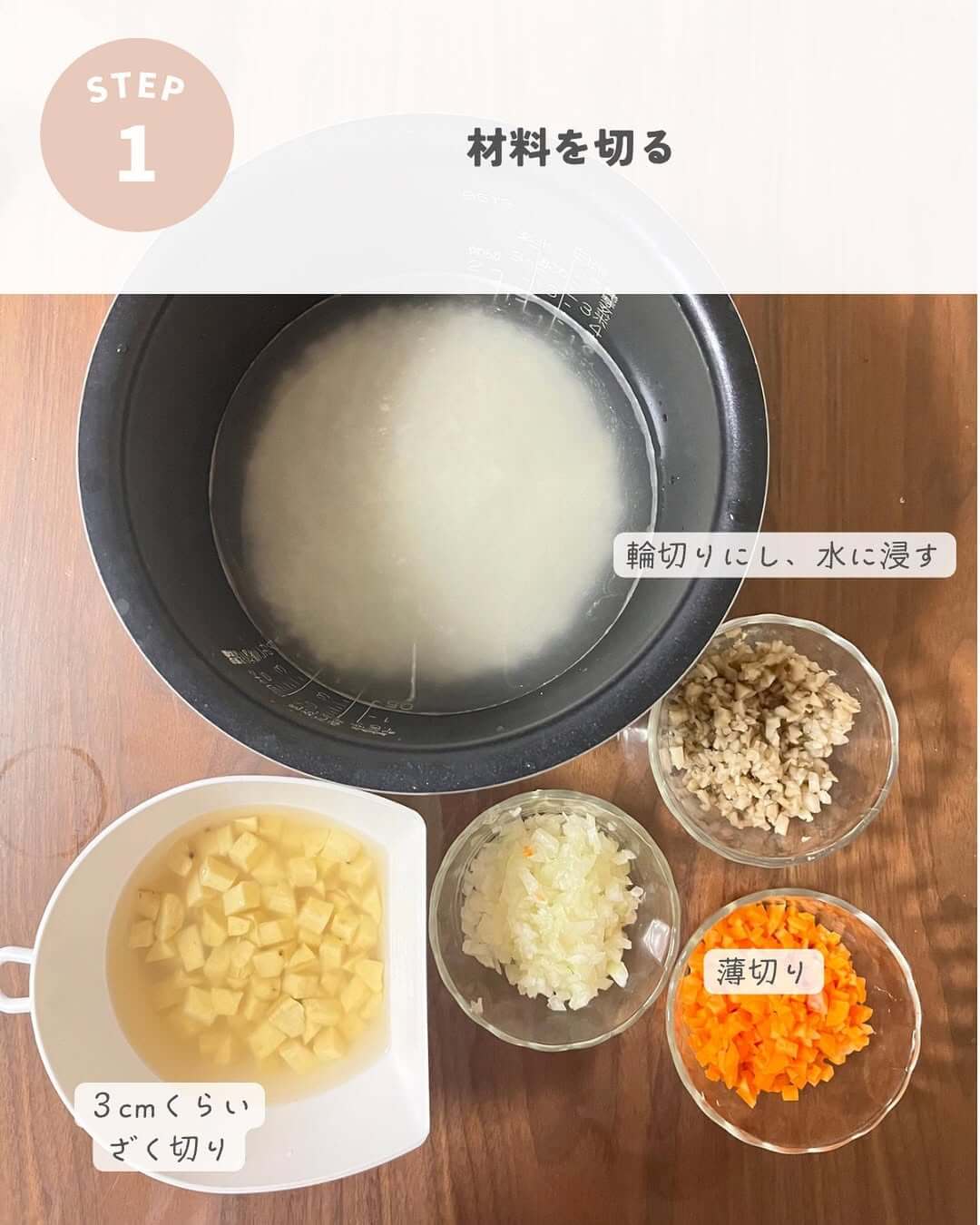 さつまいもとボーンブロス(または水+コンソメ)を加え、