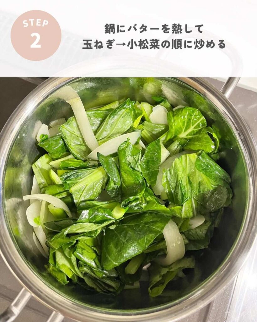 鍋にバターを熱し、玉ねぎを透き通るまで炒める。