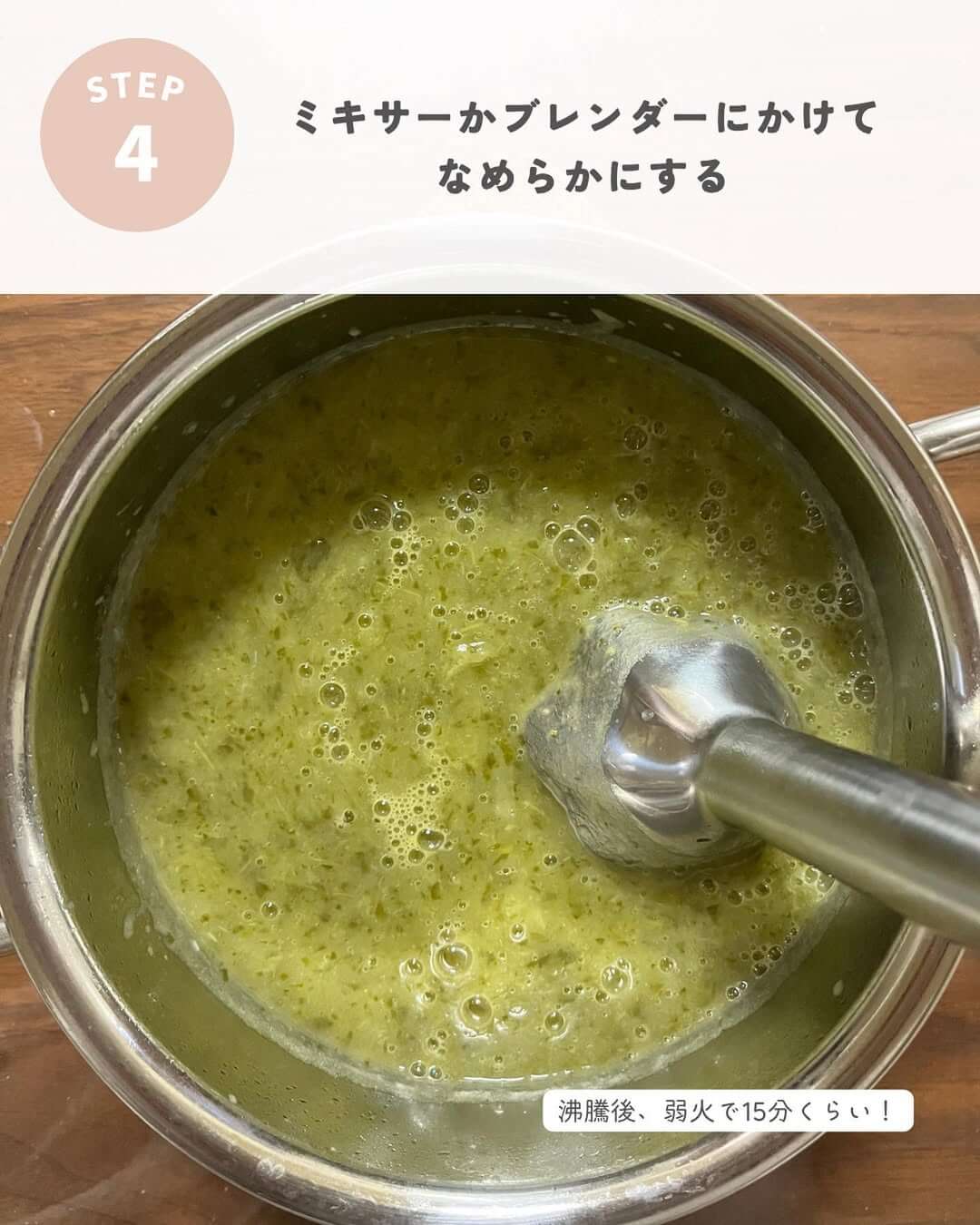 全体がやわらかくなったら、ミキサーやブレンダーでなめらかになるまで攪拌する。