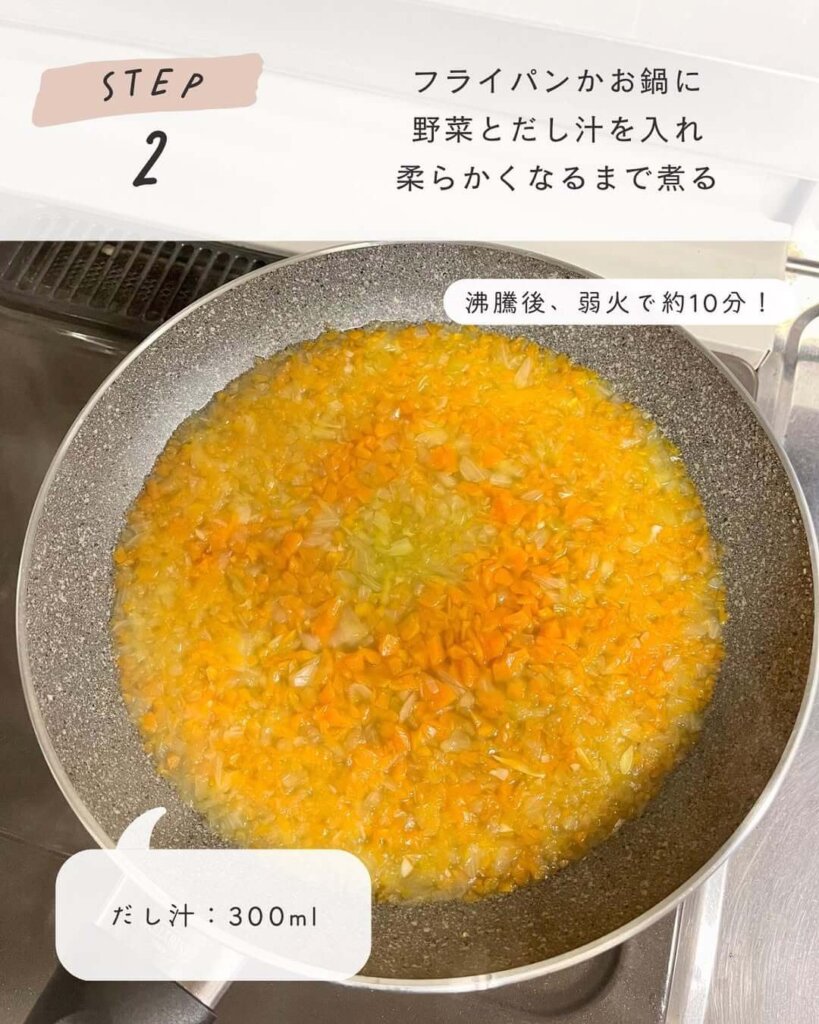 フライパンまたは鍋にだし汁と野菜を入れ、やわらかくなるまで煮ます。