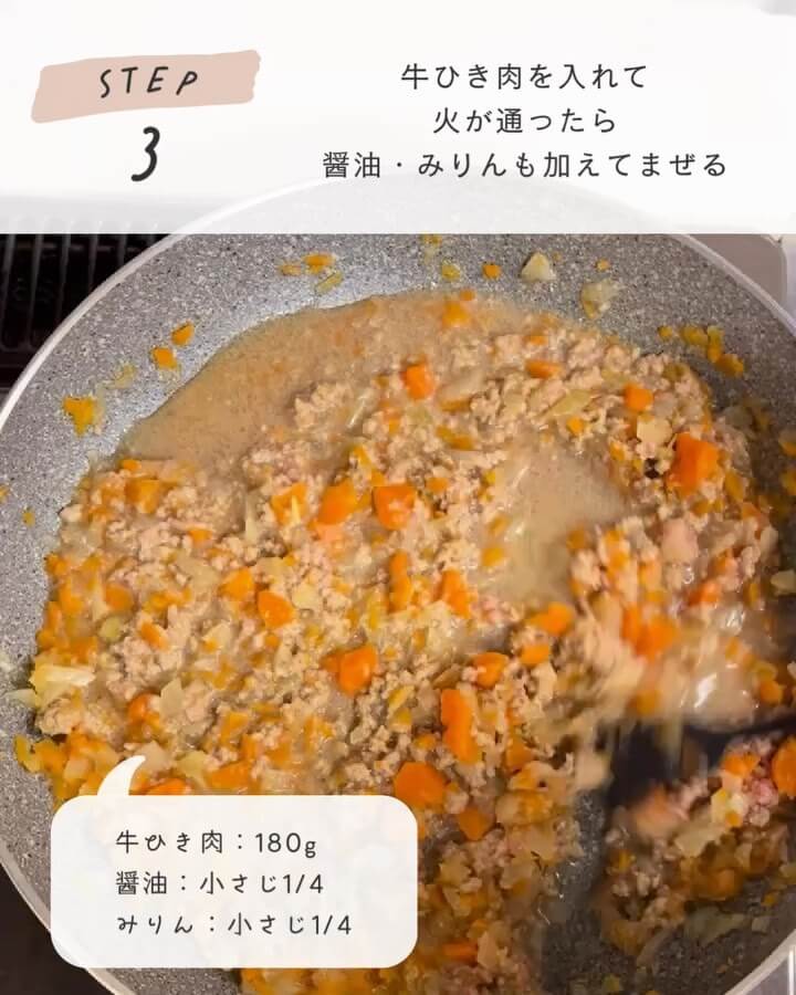 牛ひき肉を加えてほぐしながら火を通し、色が変わったら醤油とみりんを加えて全体を混ぜます。
