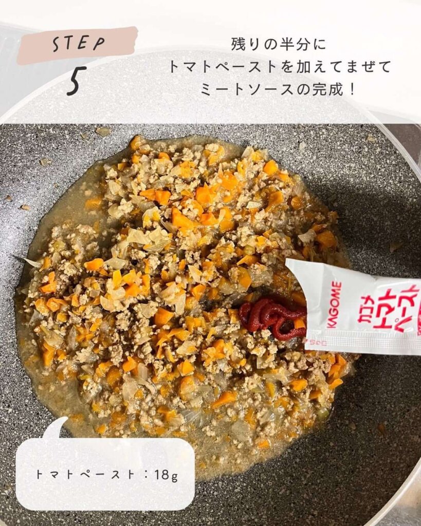 残りの半分にトマトペーストを加えてよく混ぜます🍅