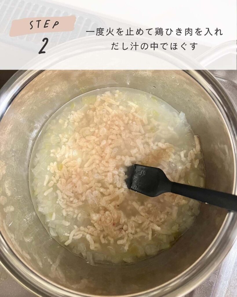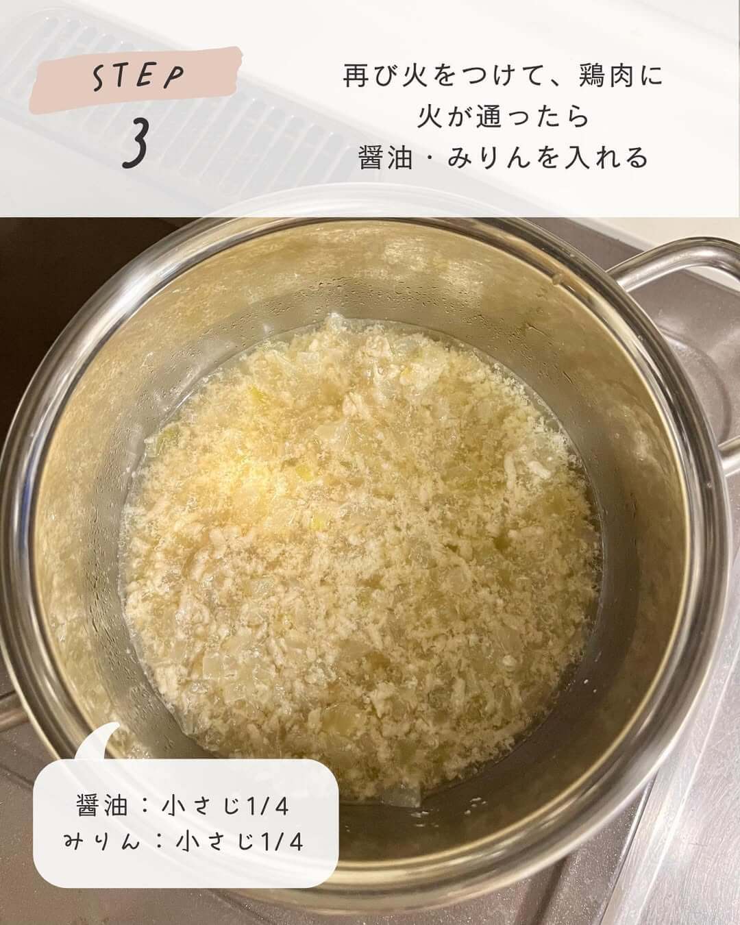 一度火を止めて鶏ひき肉を加え、だし汁の中でほぐしながら混ぜます。