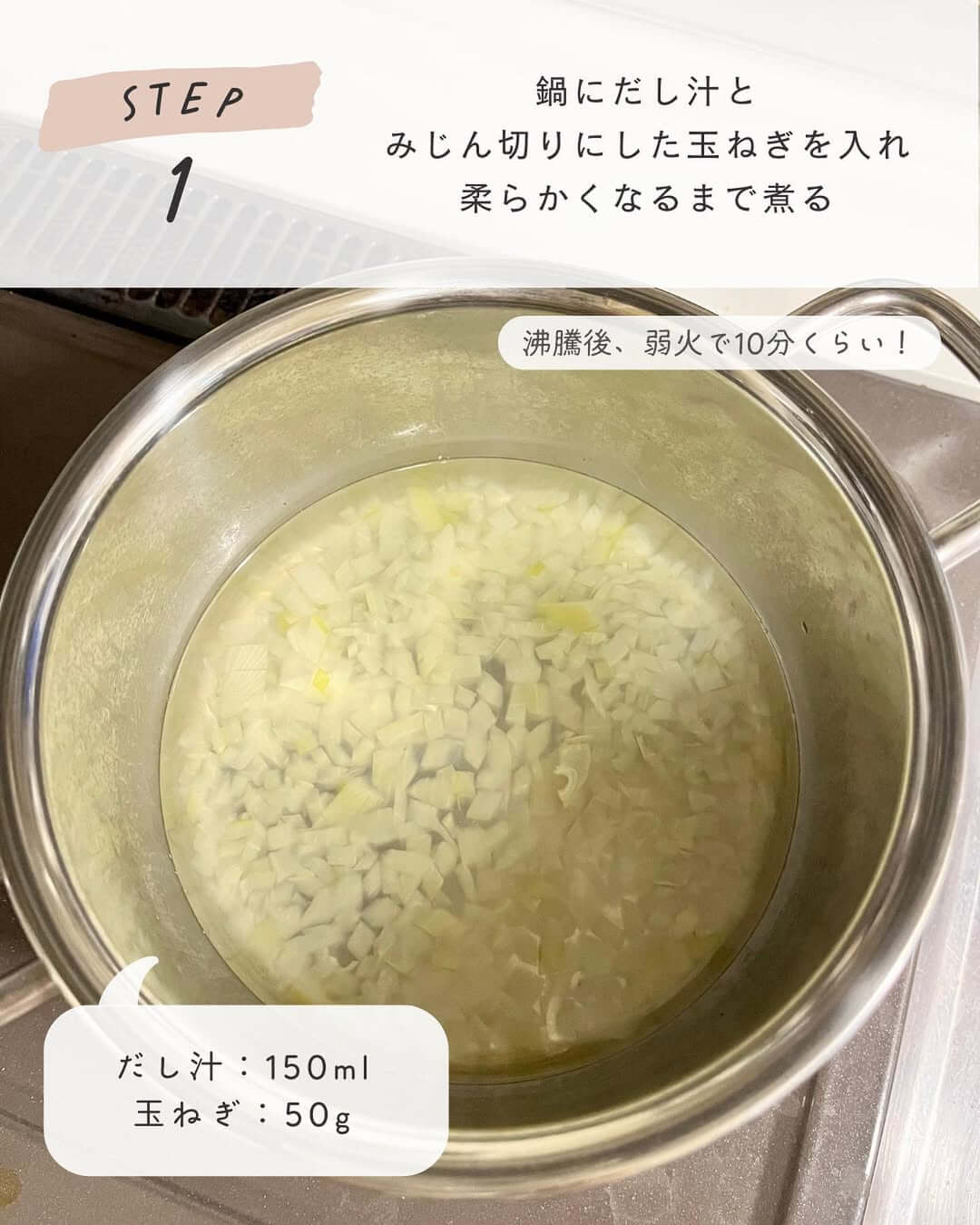 鍋にだし汁とみじん切りにした玉ねぎを入れ、やわらかくなるまで煮ます。