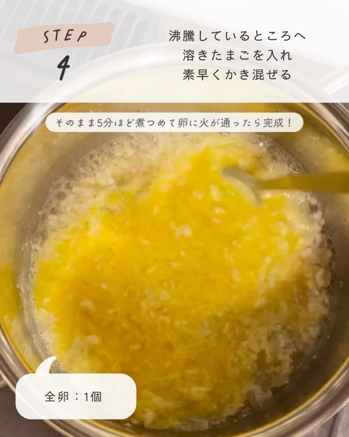溶き卵を加え、素早くかき混ぜながら5分ほど煮詰めます。