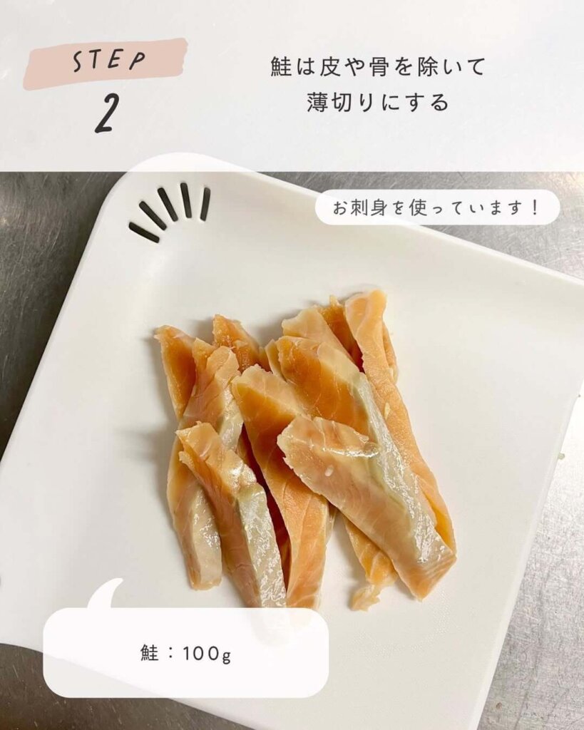 鮭は塩味のついていない生鮭か、下処理が簡単なお刺身のサーモンがおすすめ!