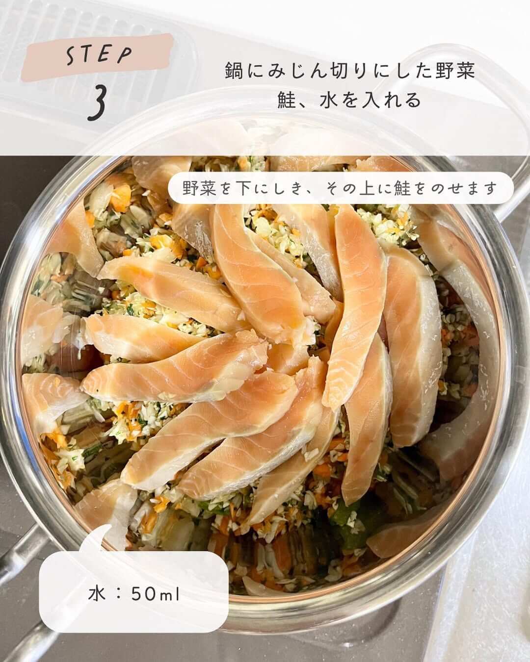 鍋に野菜を入れ、その上に鮭をのせて水を加える。