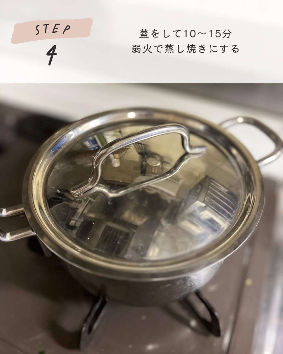ふたをして弱火で10〜15分ほど蒸し焼きにする。