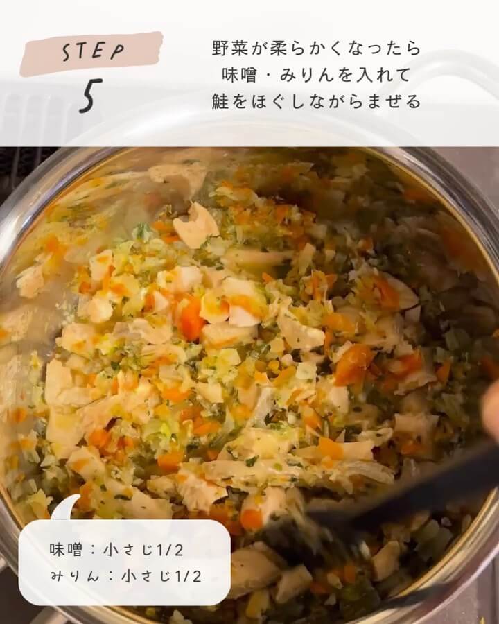 野菜がやわらかくなったら、味噌とみりんを加えて全体をやさしく混ぜながら、鮭をほぐす。